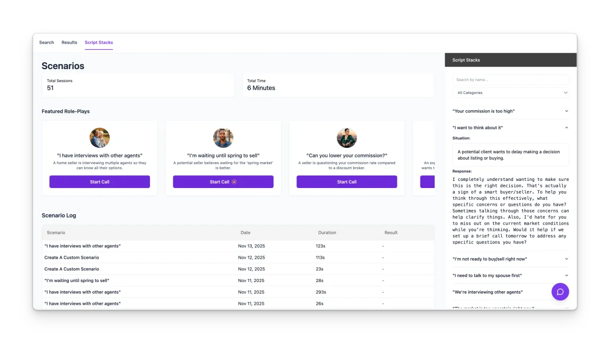 We have 20+ pre-built scenarios covering everything from "Your commission is too high" to "We're interviewing other agents" to FSBO and expired listings. Plus you can create unlimited custom ones.